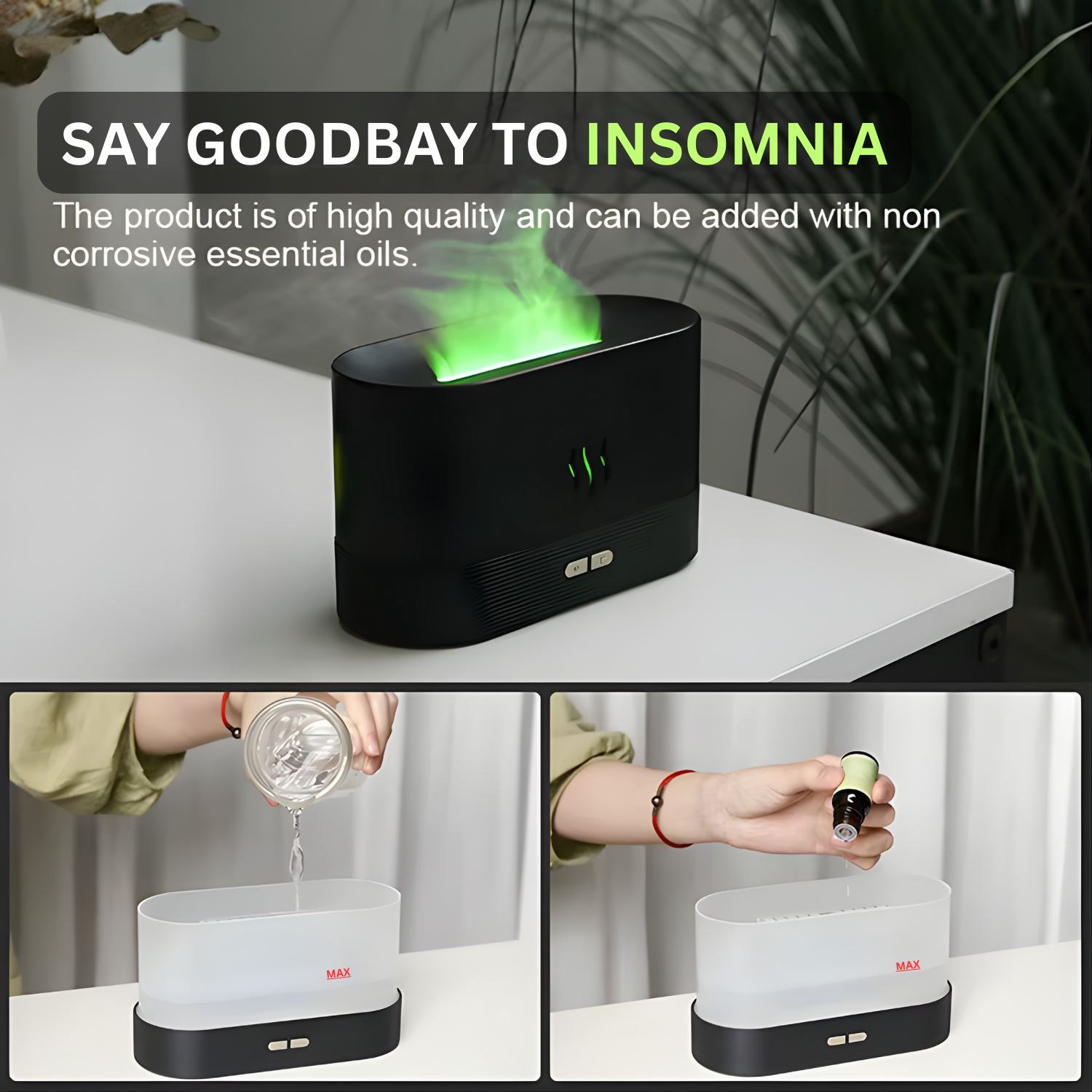 Aroma diffuser and ultrasonic cool mist humidifier with a realistic LED flame effect. Ideal for aromatherapy, relaxation, and enhancing the atmosphere at home or in the office.